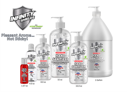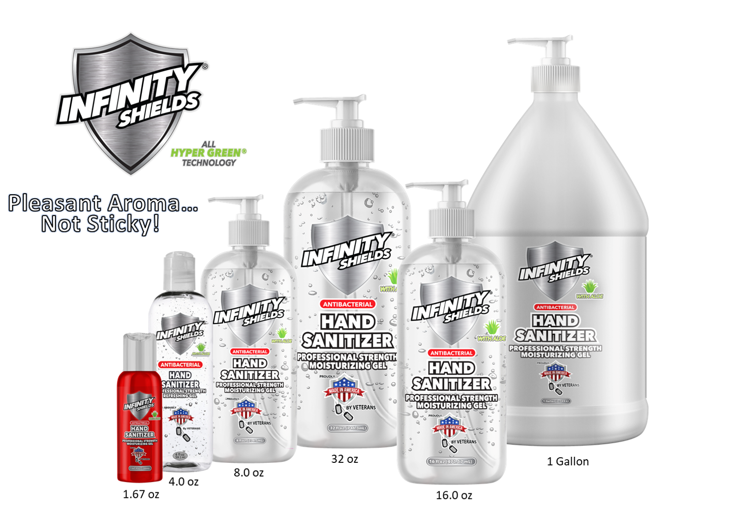 Infinity Shields® FDA-approved Antibacterial Hand Sanitizer moisturizing gel hand sanitizer with aloe 1 gallon - 65% ethyl alcohol, blended four times for odorless perfection. Our hand sanitizer is odorless and not sticky like others! Eliminates 99.9% of harmful germs and bacteria on contact. Professional strength, safe for repeated use. 100% Guaranteed! Made in America by Combat Veterans. Most advanced formula (1) 1 jug gallon with lotion pump FDA Approved: NDC 73763-475-05 Pleasant aroma, not sticky Refreshing gel with Aloe Trusted and used by Fortune 500 companies in Aviation, Solid Waste, Healthcare, and Hospitality Safe for repeated use Made in America by Veterans