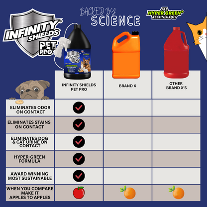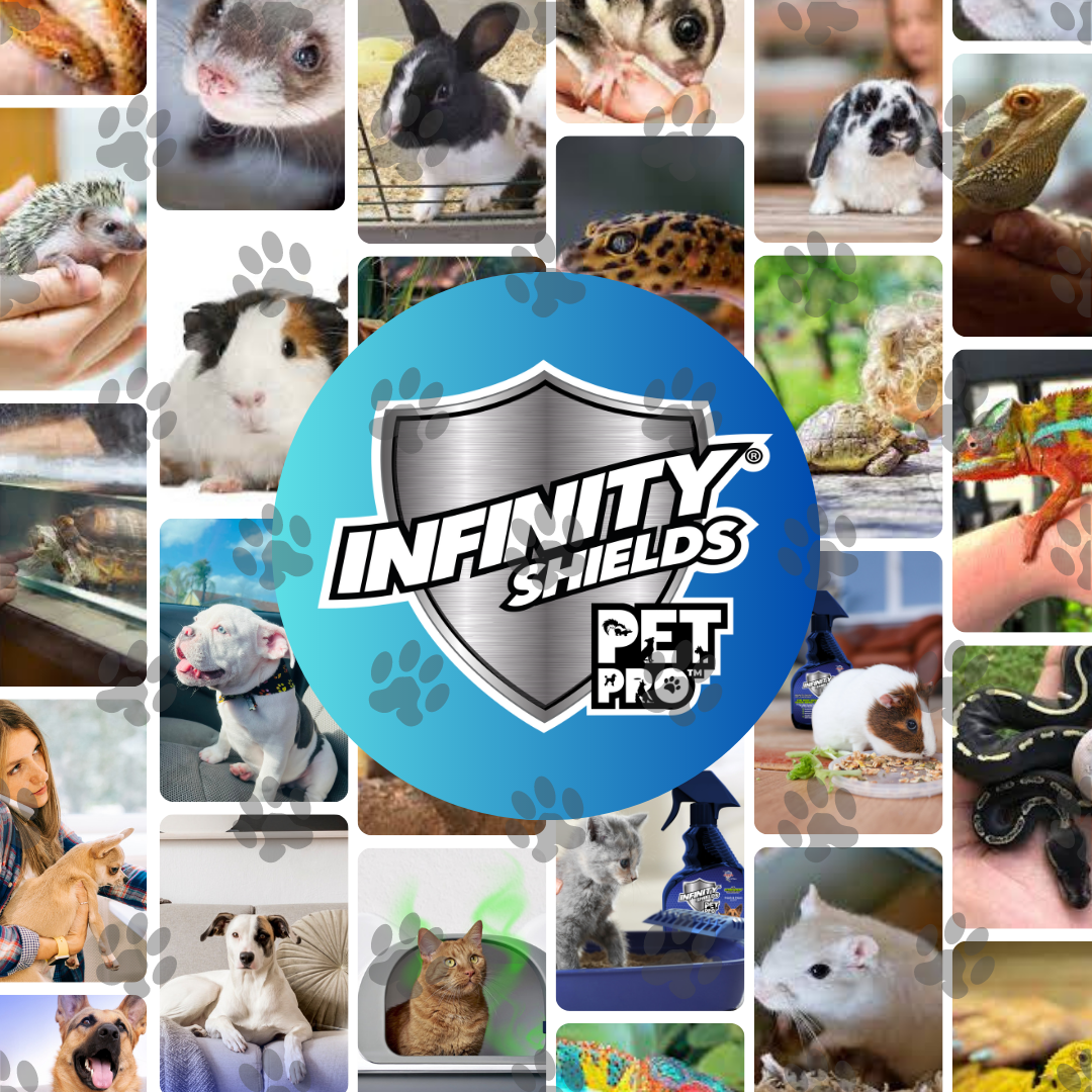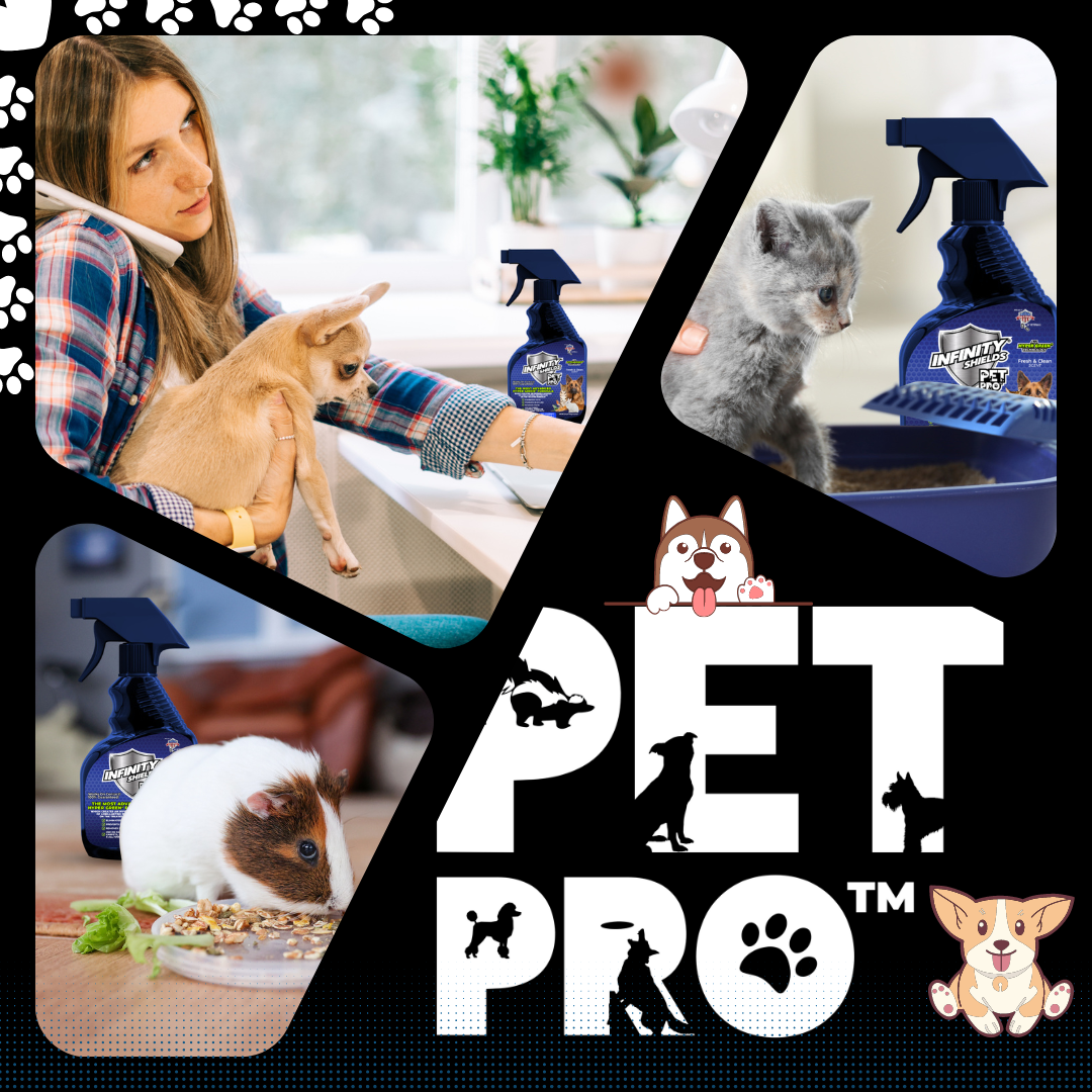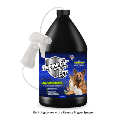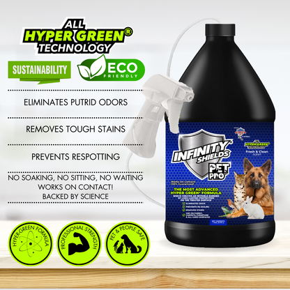 Infinity Shields® Pet Pro™ (128 oz) Case of 4 is eco-friendly, sustainable, and Hyper-Green Safe. Pet Pro is the most advanced product. Backed by molecular science, Pet Pro is a multi-purpose cleaner, eliminator, and protectant that works on contact, eliminating odor, removing stains, and preventing re-marking and re-soiling. Never has a pet product been this economical. Pet Pro provides long-lasting results. Domestic and exotic pet hygiene has advanced to an entirely new level. Pet Pro is highly recommended by occupational pet owners. Infinity Shields® Pet Pro™ continues to work because once applied to the treated surface, Pet Pro creates an invisible barrier of long-lasting protection. This new invisible surface creates a matrix and will not rub off or cause off-gassing, which can harm our pets' keen sense of personality and smell. Pet Pro provides continued efficiency and works on fabric, textiles, carpets, kitty granular, all hard surfaces, and more. Pet Pro is WERCSmart® Registered. MADE IN AMERICA BY VETERANS